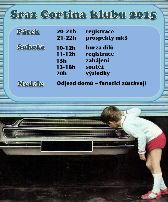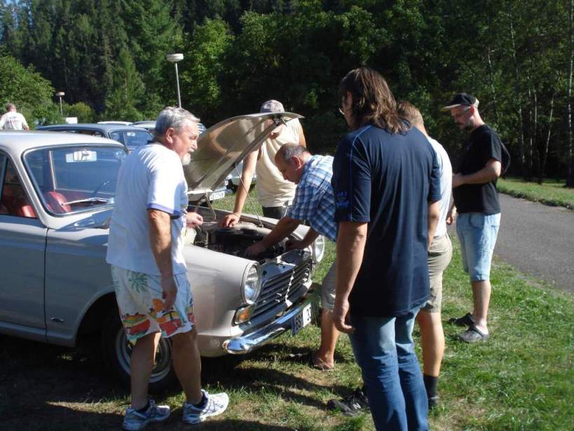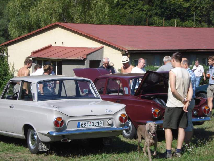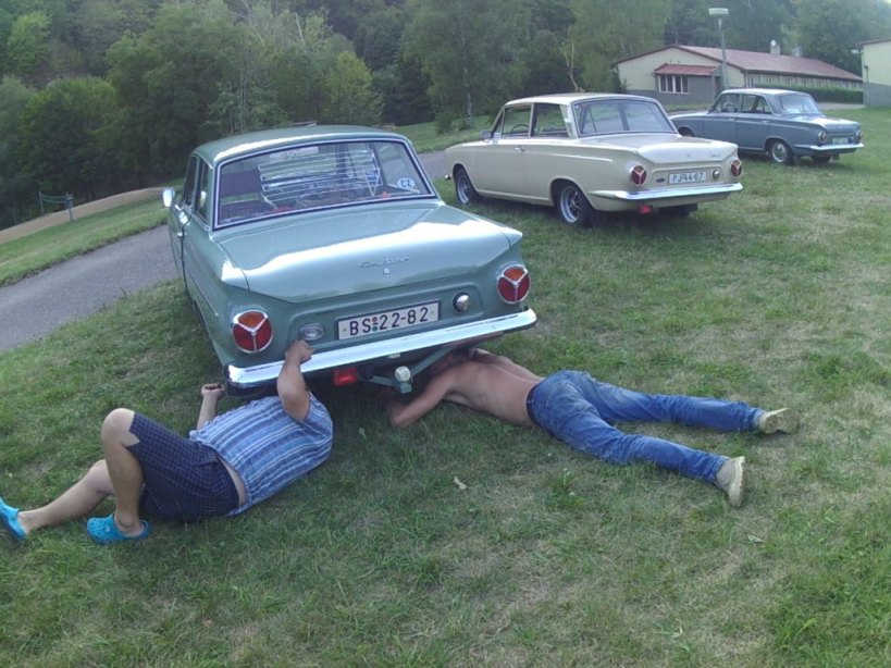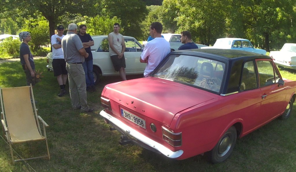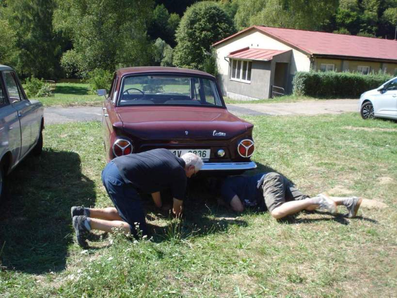 Na letošek jsme připravili jen jízdu s hledáním písmen, ze kterých bylo potřeba složit tajenku znějící Dagenham a hledání znaků cortina v zahradě v Talmberku. No a v cíli všemi nenáviděný kvíz na téma součástek z cortin. Neplánovaným zpestřením byla i výměna hadice chlazení na "Káře srazu"....a byli i další, kteří z různých důvodů polehávali pod svými i cizími vozy