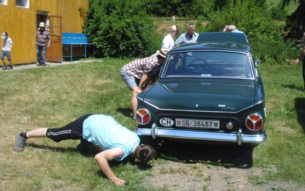 Většina z 20 aut dorazila za pomoci vlastních koňských sil....jedna čerstvá renovace na plaťáku....a "Kára, která má každý rok jinou barvu" na laně. Spojková hadička propálená o výfuk. No a jedna "emkátrojka" skončila na dálnici s povysunutou poloosou.