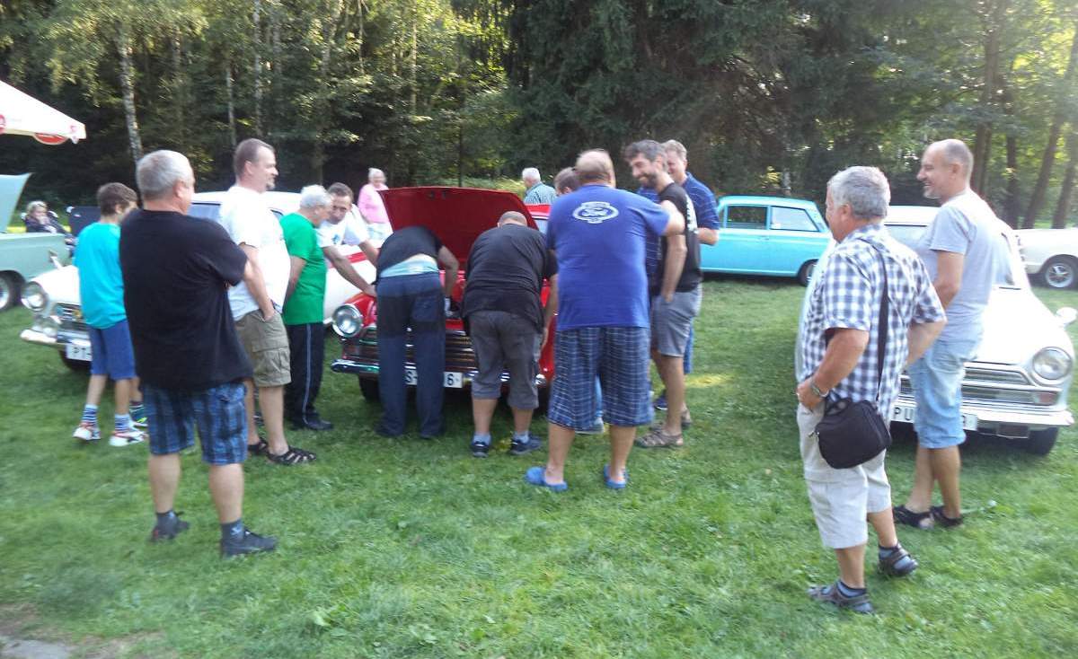 Díky letošnímu nízkému počtu soutěžících, jsme byly se všemi soutěžemi poměrně rychle hotovi, a byl tak čas na rozličné kratochvíle kolem zaparkovaných vozů. Asi tou nejzásadnější byla otevřená kapota červené cortiny s brněnskou značkou. Ve stylu "máte štěstí, že jdu zrovna kolem" se u ní zastavovali další další cortináři, až se dá říct, že se hrozen mechaniků téměř nevešel do hledáčků našich paparaziů. Ona totiž chuděra měla nějaké trápení s chodem motoru, a zde všechna čest majiteli, který to s ní ze Slavkova dovalil. Každopádně po asi třetí testovací jízdě, se už zpátky do areálu vrátil na laně.