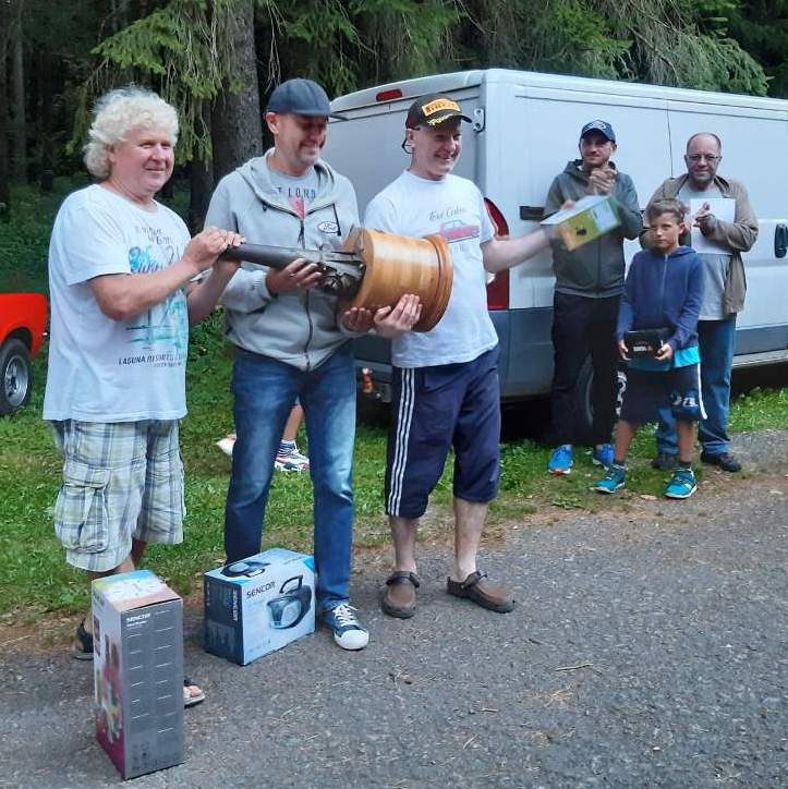 V 19h proběhlo vyhlášení soutěží - Největším znalcem součástek se ukázal Jarda Kozák, Jízdu zručnosti nejlépe projel Kuba Kadlec, a to s plně obsazenou emkátrojkou! U káry srazu musím za sebe říct, že se nevyplácí odjíždět předčasně, neb si myslím, že se na srazu otočilo spoustu nádherných aut. Vítězem se stejně jako loni stala Mk3, tentokrát čtyřdveřová Line1. Druhé místo zas potvrzuje názor, že pokud na sraz přijede neokoukané auto, rádi ho obodujeme! Je to alespoň drobná útěcha za zpáteční cestu na podvalu. Na třetím místě je auto, u kterého jsem si říkal, že ho na prvních pozicích vídám nějak často....tak jsem si prohnal všechny srazy od roku 2014, a věřte nevěřte, ale Mk1 Míry Silovského se na "bedně" umístila ze 7 srazů hned 6x! Cortinář srazu...to byl letos nerozlousknutelný ořech. V celkovém bodování se nám totiž shodně umístili tři cortináři, a body v jednotlivých soutěžích byly natolik vyrovnané, že to skutečně nestačilo na obhajitelné prvenství jednoho z nich. Kdyby byli dva, necháme je zápasit, ale takto jsme skutečně poprvé museli přistoupit k multiplikaci označení "Cortinář srazu", a na trofeji tak k letošnímu roku budou tři jména. Vyhlášení jsme stihli akorát před bouřkou, tak jsme se poschovávali do hospody a pod deštník, Olda míchal beton, a družba pokračovala hluboko do tmy.