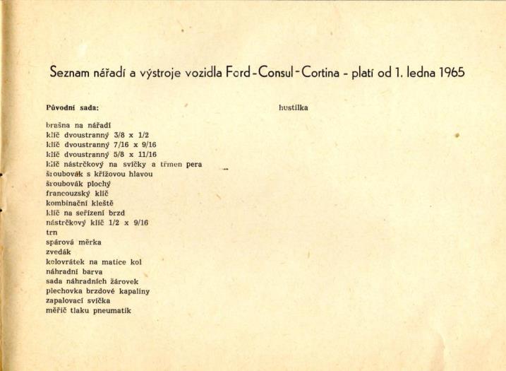 Fotodokumentace níže ukazuje originál příslušenství, dodávané k vozům cortina v ČSSR. Může se lišit od vozů dovezených z jiné země